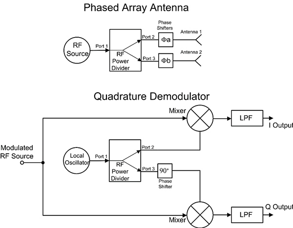 The power divider splits the input into two or more branches usually with an equal portion to each branch.