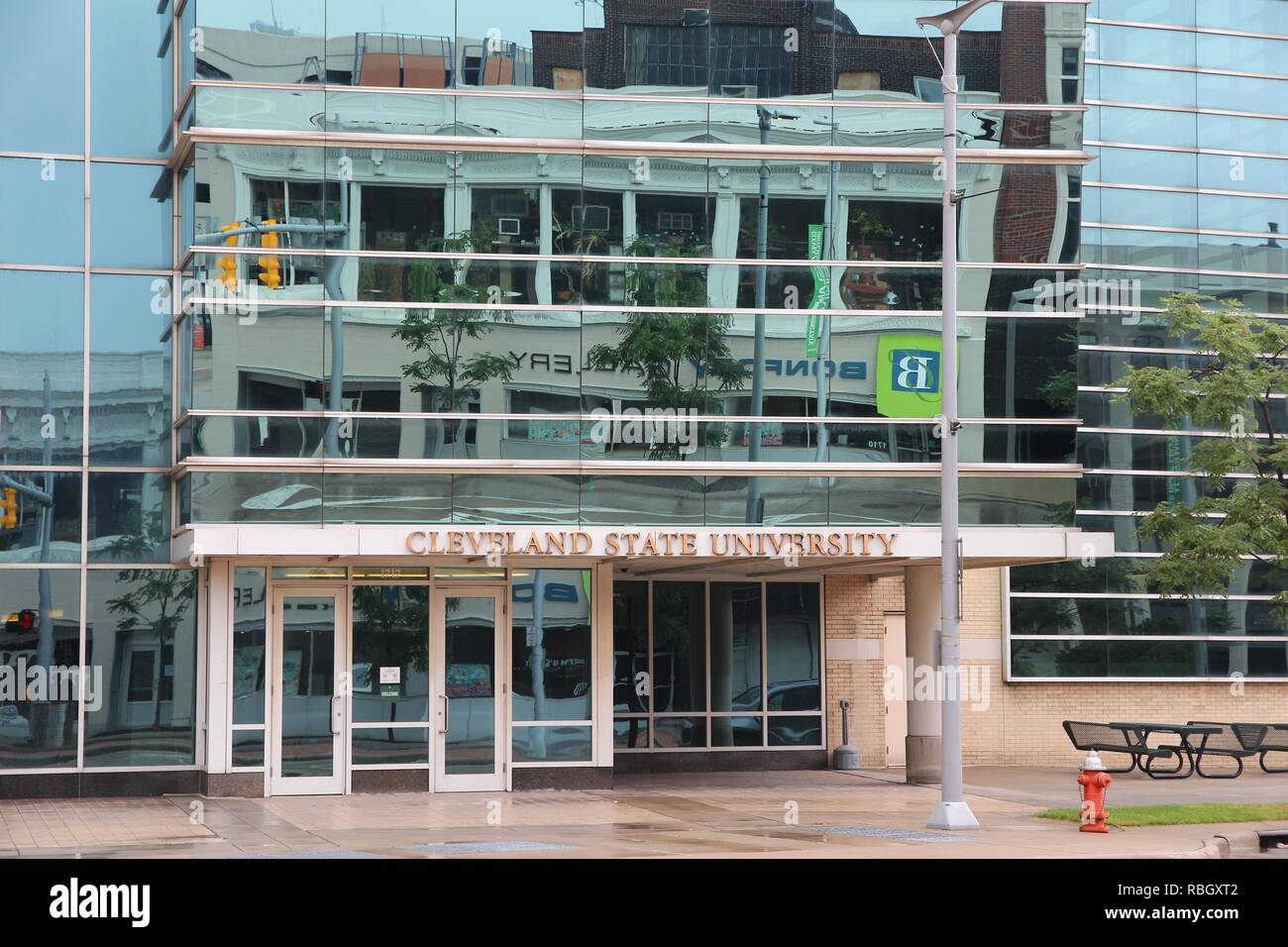 The 500 000 square foot steel skyscraper in downtown cleveland ohio houses the university s four floor main library academic offices and the mechanical room.
