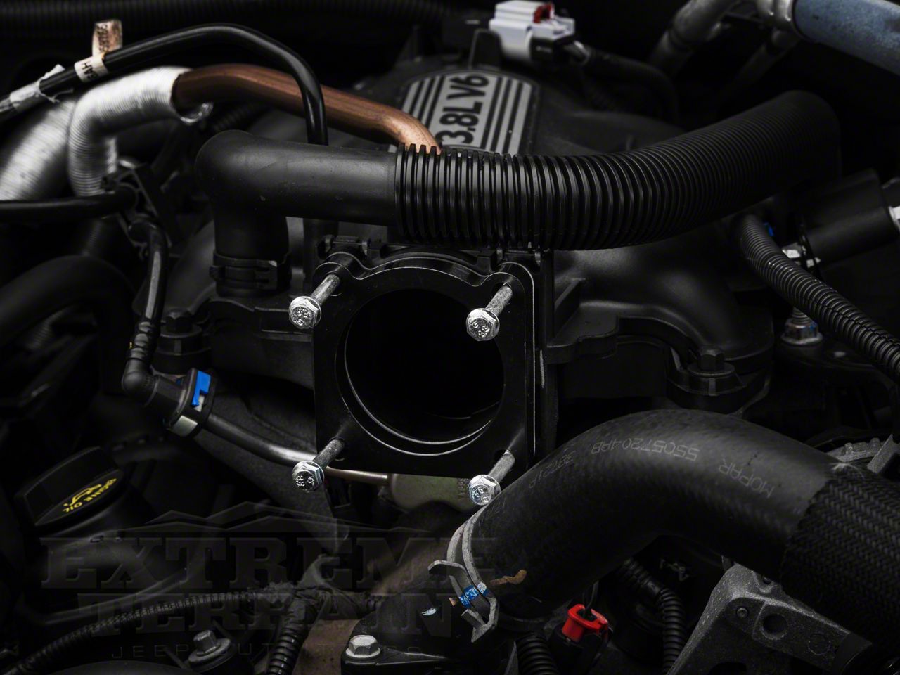 The rugged ridge throttle body spacer moves the throttle body away from the intake manifold.