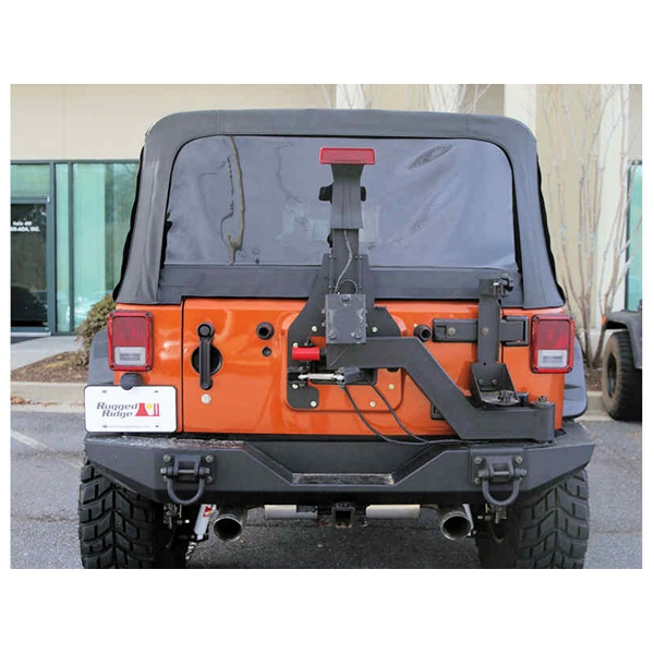The rugged ridge tire carrier is designed for 2007 2018 jeep wrangler jk models equipped with rugged ridge s xhd rear bumper.