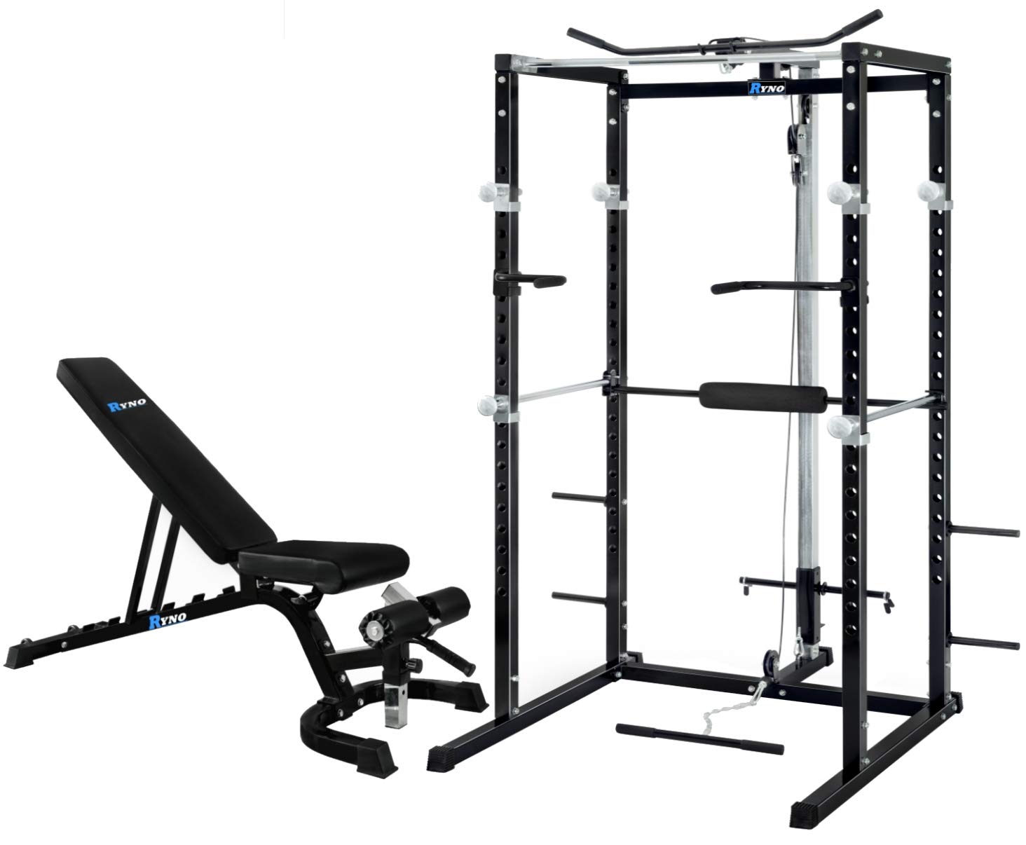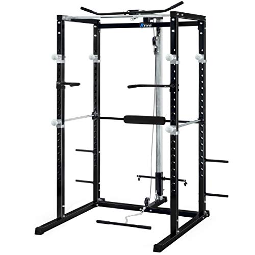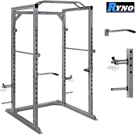 Pr500 ryno power rack dip handles tricep rope pull down attachment lat pull down attachment straight bar attachment foam covered utility bar 4 x 1 plate storage rods with clips 4 x solid steel chrome adjustable barbell drops 2 x solid steel chrome squat safety bars 1 x chrome pull up bar colour options.