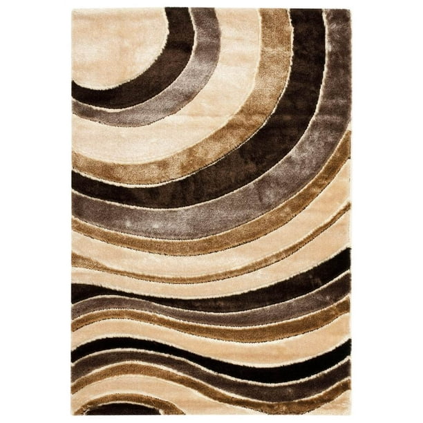 High density polypropylene pile foundation and a raised polyester pile features a brown background with accents of cream beige and brown and provides one of the most silky smooth look and feel available in a rug.