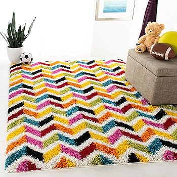 Safavieh s playful kids shag rug collection features bright colors and a plush surface a fun chevron pattern adds visual geometric interest and its many colors make decorating a breeze fashionably versatile this rug works in the bedroom playroom nursery or living room.