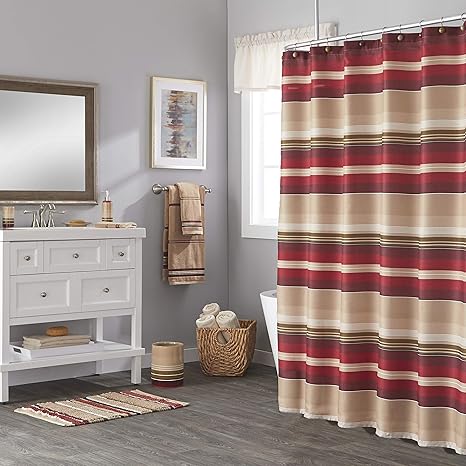 Madstrcoll with a traditional striped design and deep shades of red and neutral colors this bath collection is an effortless way to add a touch of personality to your bathroom.